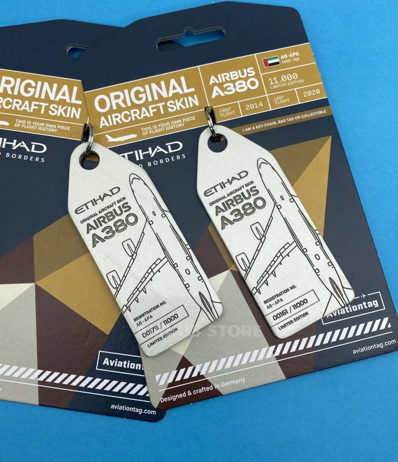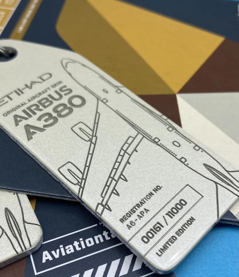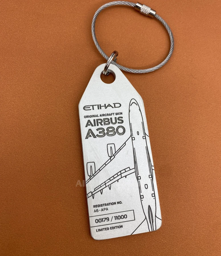 A unique airplane tag made from a genuine Emirates Airbus A380 body, the legendary A6-EDA. A limited edition dedicated to the airports visited by the aircraft.