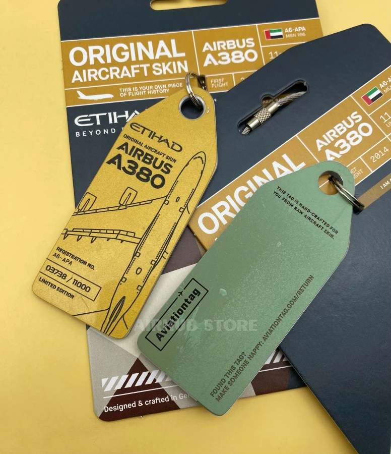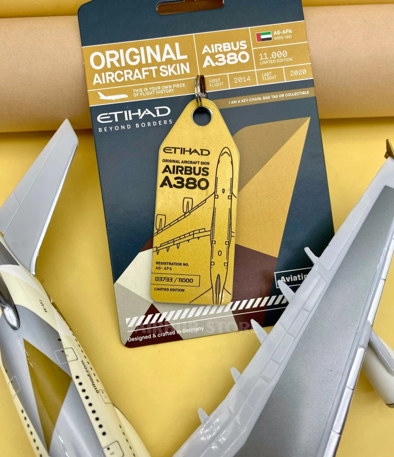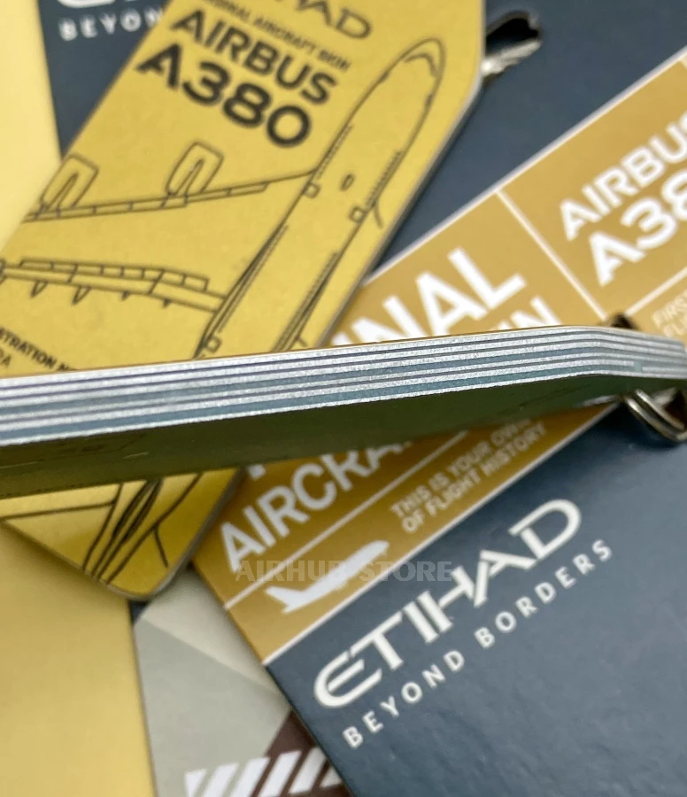 An original aircraft tag made from genuine Etihad Airways Airbus A380 skin. A real piece of the legendary A6-APA aircraft, transformed into a collectible accessory with a history.