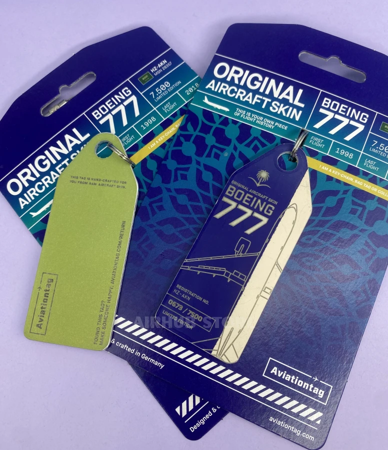 This collectible tag is made from a part of the fuselage of a Boeing 777-200ER with the registration number HZ-AKN, which flew under the flag of Saudi Arabian Airlines for 20 years. The aircraft, which can accommodate 341 passengers, made its maiden flight in 1998 and took off for the last time in 2018, after which it was sent for storage in the United States.