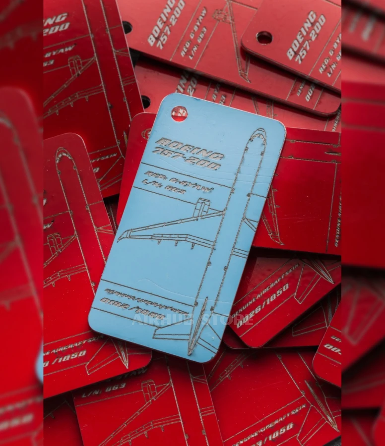 This B757 airplane skin keychain was one of fourteen aircraft in the TUI Airways fleet and operated most of its flights from Gatwick and Manchester airports for tourist purposes. The G-BYAW aircraft has a long history - it was originally part of the Britannia Airways fleet in 1995. In 2005, the management company Thomson Holidays rebranded its subsidiaries, as a result of which Britannia Airways changed its official name to Thomsonfly, which has now been renamed TUl Airways. In 2019, the aircraft was decommissioned and acquired by 2Excel Aviation as a spare parts donor. Thanks to 2Excel Aviation - Fuselage Creations were able to produce these tags for B757 fans around the world!