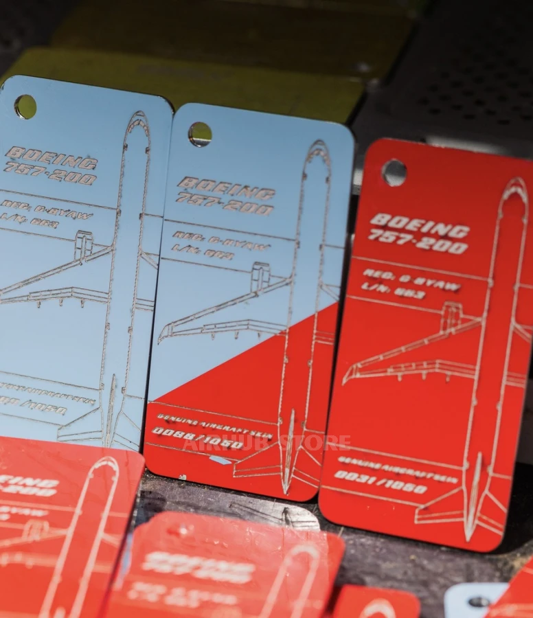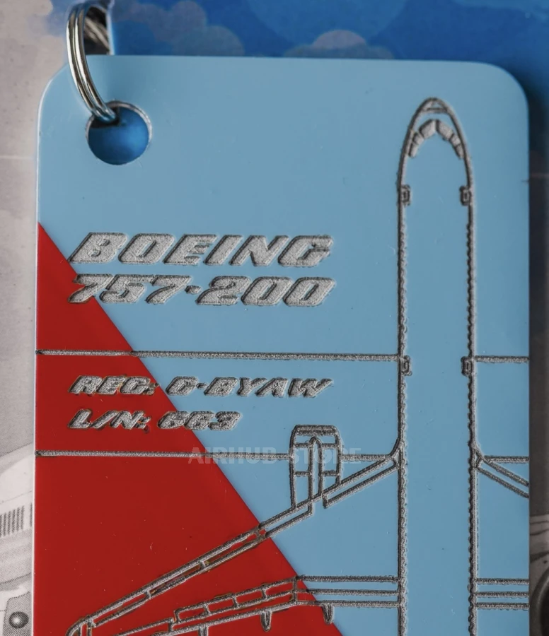 This B757 airplane skin keychain was one of fourteen aircraft in the TUI Airways fleet and operated most of its flights from Gatwick and Manchester airports for tourist purposes. The G-BYAW aircraft has a long history - it was originally part of the Britannia Airways fleet in 1995. In 2005, the management company Thomson Holidays rebranded its subsidiaries, as a result of which Britannia Airways changed its official name to Thomsonfly, which has now been renamed TUl Airways. In 2019, the aircraft was decommissioned and acquired by 2Excel Aviation as a spare parts donor. Thanks to 2Excel Aviation - Fuselage Creations were able to produce these tags for B757 fans around the world!