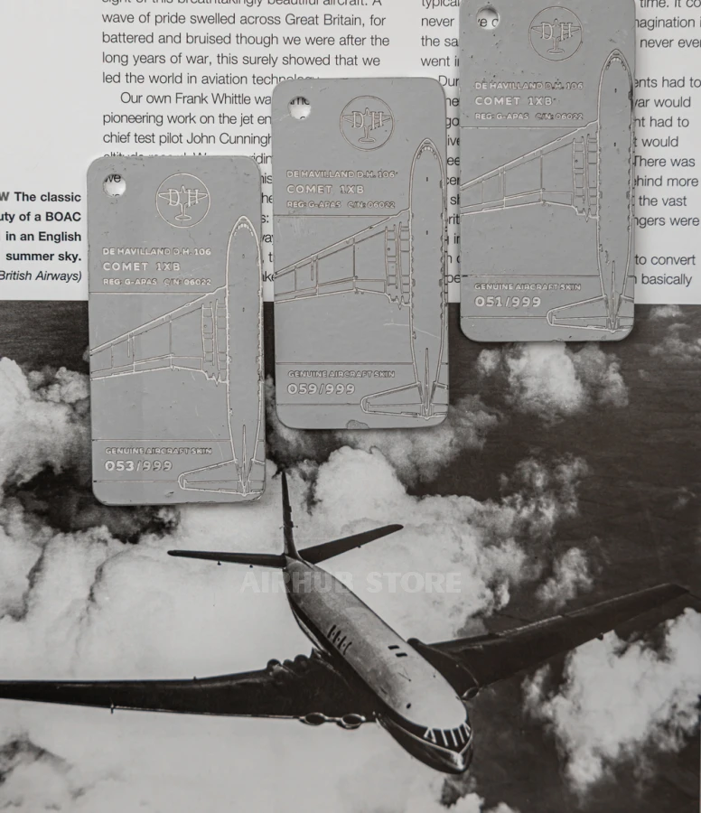 This keychain is made from authentic metal from the De Havilland DH.106 Comet, the world's first commercial passenger jet airliner. It was the Comet that ushered in the jet age of civil aviation, making its maiden flight in July 1949 and commencing regular service in 1952 with BOAC.