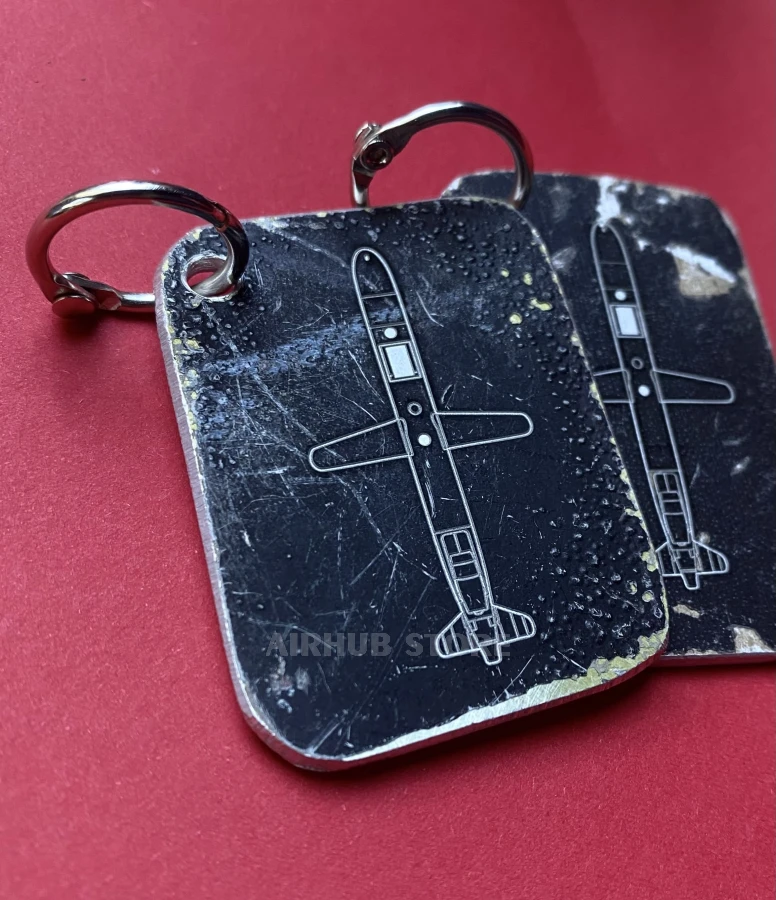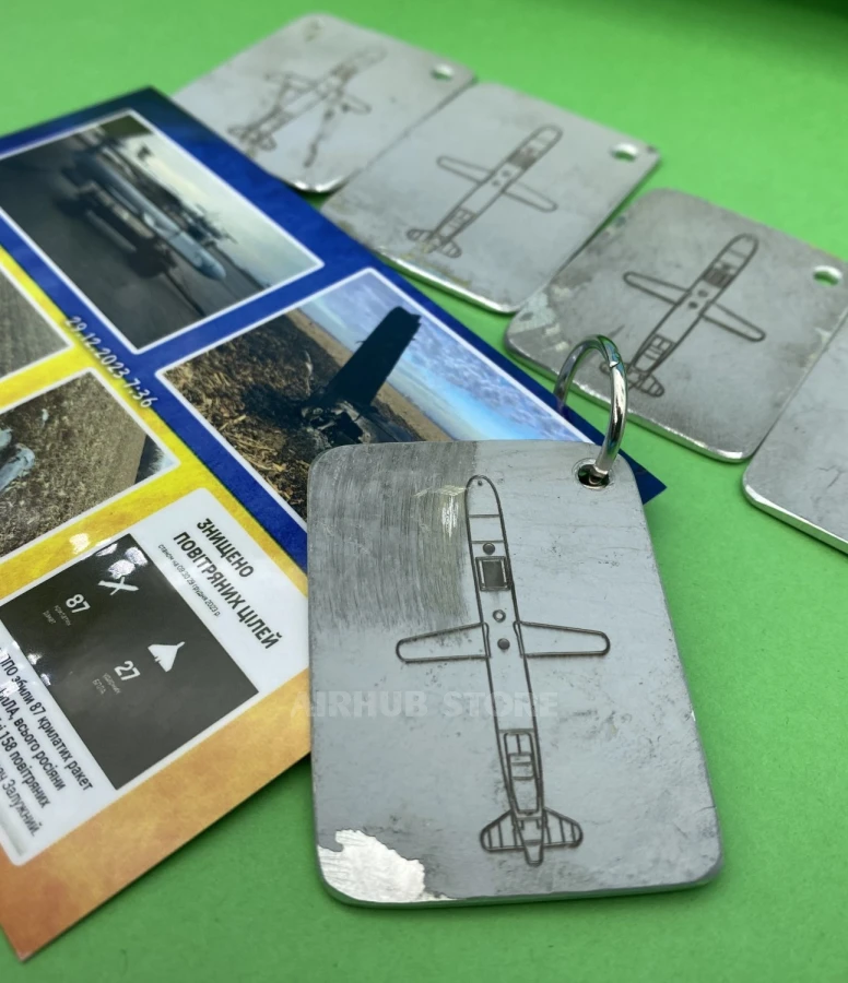 The keychain is made of real airplane skin, the airplane is cut into 286 pieces of keychains, each with its own unique number. The keychains are cut from the fuselage of a Mi-24P, military number 32 Red, registered as RF-95286. It was shot down near the village of Kozarovychi in the Kyiv region of Ukraine on March 5, 2022.