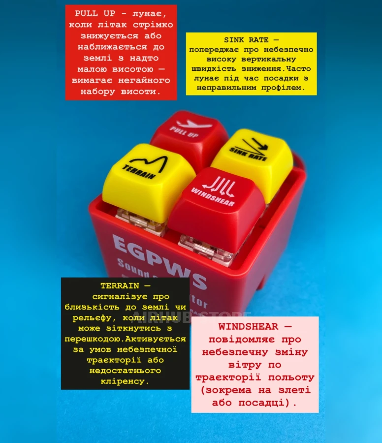 The EGPWS Sound Simulator is a unique keychain based on the real-life Enhanced Ground Proximity Warning System. This gadget has four function buttons: