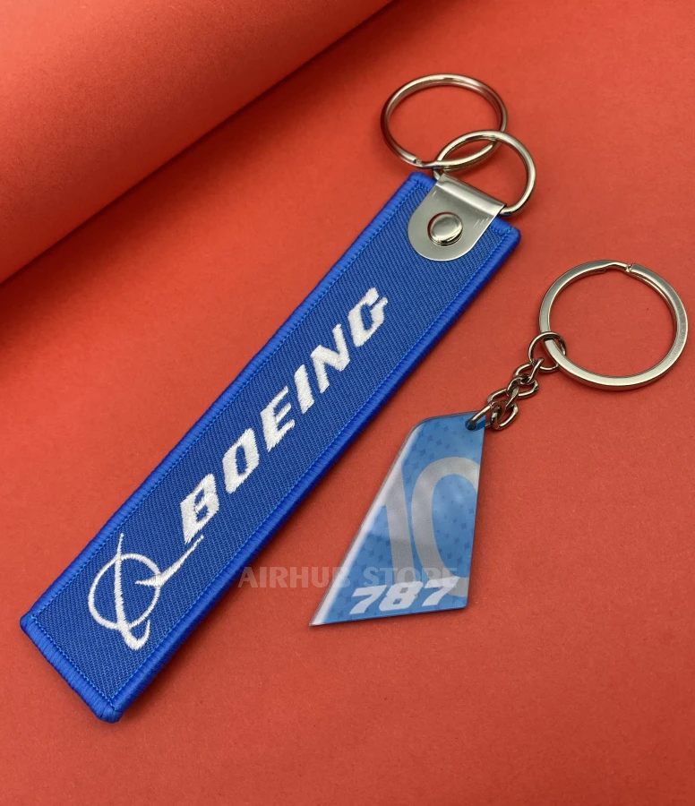 This keychain set is dedicated to one of the most beloved airplanes - the Boeing B787. The set includes two keychains: the first one is a textile keychain made in a classic style with an embroidered inscription. The second keychain is in the form of a B787 keel.