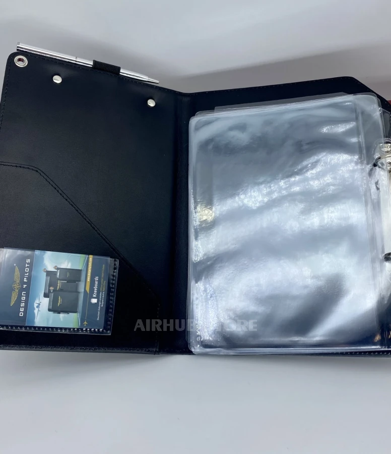 The PROFI lap board has a ring mechanism on the right, with a standard A5 width, for organization to keep your hand free during flight. Inside, there are 6 transparent pockets for approach charts and checklists, a map pocket, and a business card pocket.