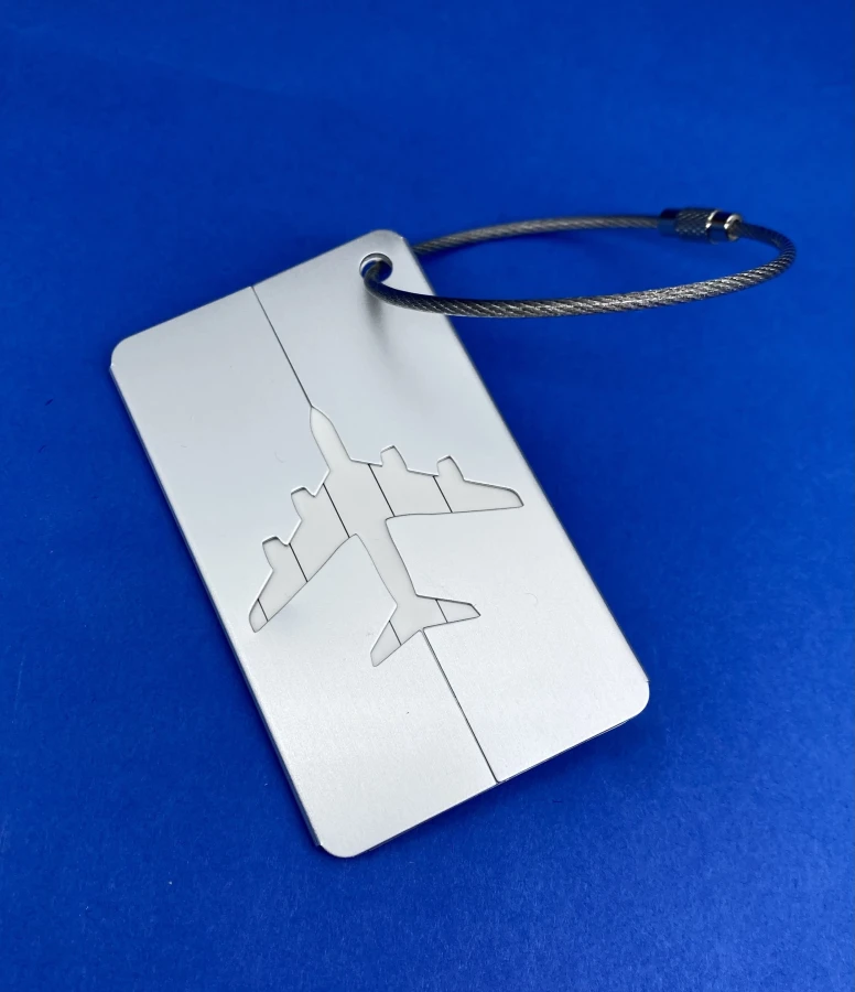 The tag is made of durable metal and has a neat coating with a clearly cut outline of an airplane. This gives it a modern, minimalist, and at the same time thematic look — ideal for those who love aviation details in everyday items.