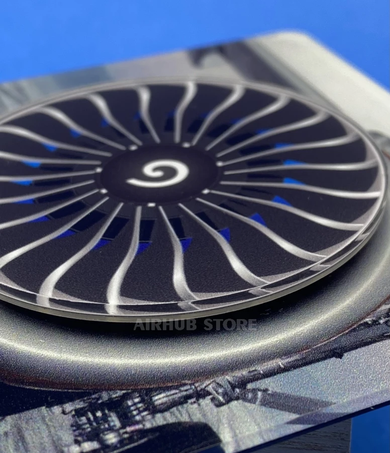 The design is modeled after modern turbofan engines, with detailed blades and a distinctive center section reminiscent of real aircraft engines. The background featuring an airplane landing gear adds to the airport atmosphere and enhances the sense of real aviation.
