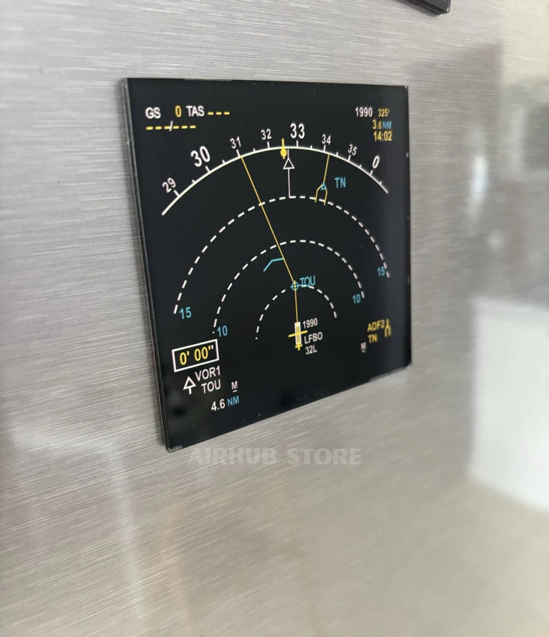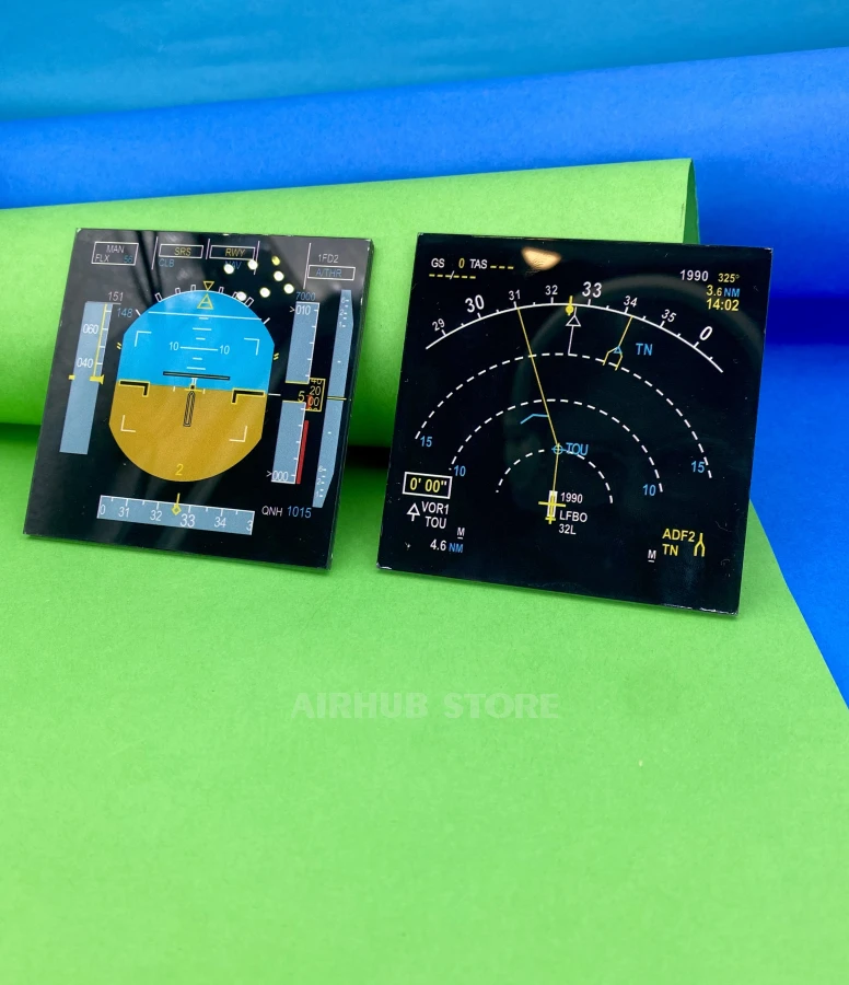 This magnet set reproduces the two main screens in the Airbus A320 cockpit: the Primary Flight Display (PFD) and the Navigation Display (ND). These are the displays that pilots see every day during takeoff, flight, and landing.