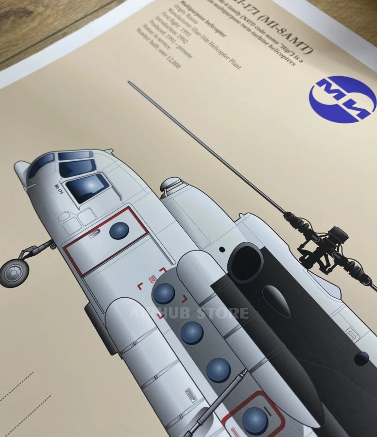 Poster with schematic images of the aircraft, its technical characteristics and interesting information. This poster shows the MI-171 helicopter. The Mi-171, or Mi-8AMT, is a multi-purpose helicopter and is a modern export modification of the Mi-8/Mi-17 helicopter.