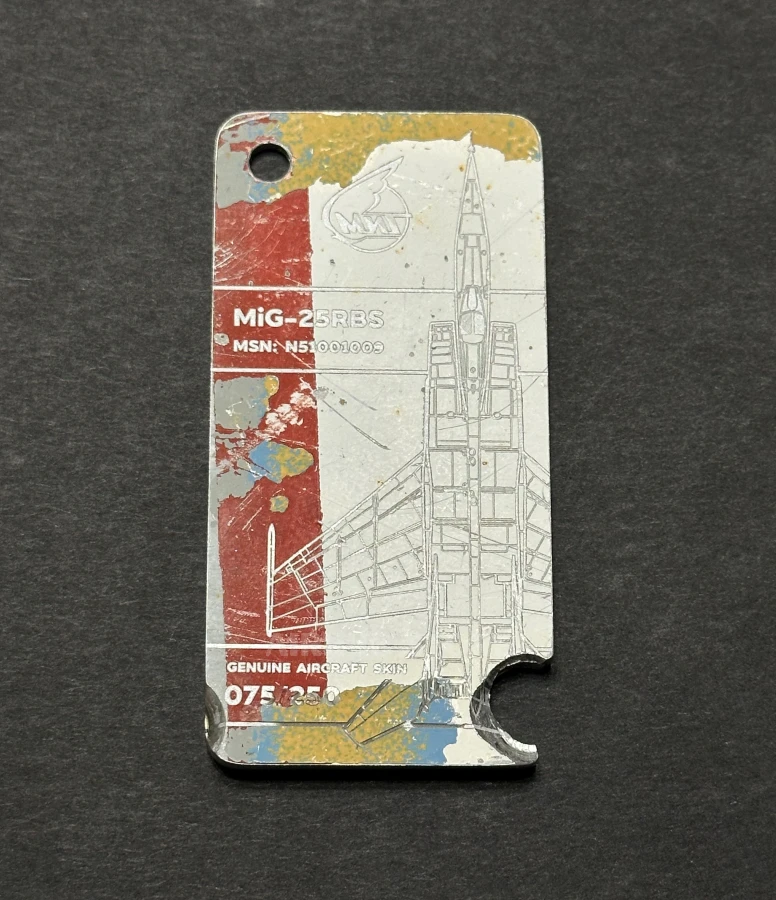 In the early 2000s, after the MiG-25 was finally retired from service with the Ukrainian Air Force, the aircraft was transferred to the Oleg Antonov State Aviation Museum. During the restoration of the vertical stabilizer, the team at Fuselage Creations was able to preserve a section of the skin and transform it into commemorative keychains. That is why this keychain is not just an accessory, but a real piece of aviation history that allows you to literally touch a legend.