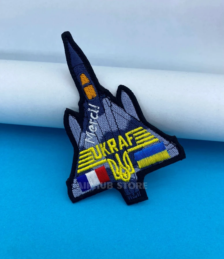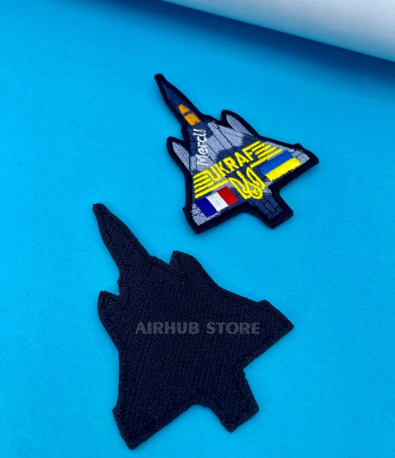 This aviation patch is shaped like the legendary Dassault Mirage 2000 fighter jet, a French multi-role combat aircraft with a distinctive delta wing. The design combines the national trident and flags of Ukraine and France, emphasizing the military-political partnership and support for Ukraine.