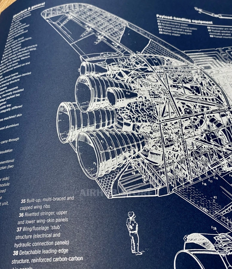 Poster with Nasa Space Shuttle drawing, the dark blue poster shows the layout diagram of this shuttle. All elements are numbered and described around the image, where a transcript with description is provided. The poster itself is printed on heavy blue paper, measuring 75 cm by 33 cm.