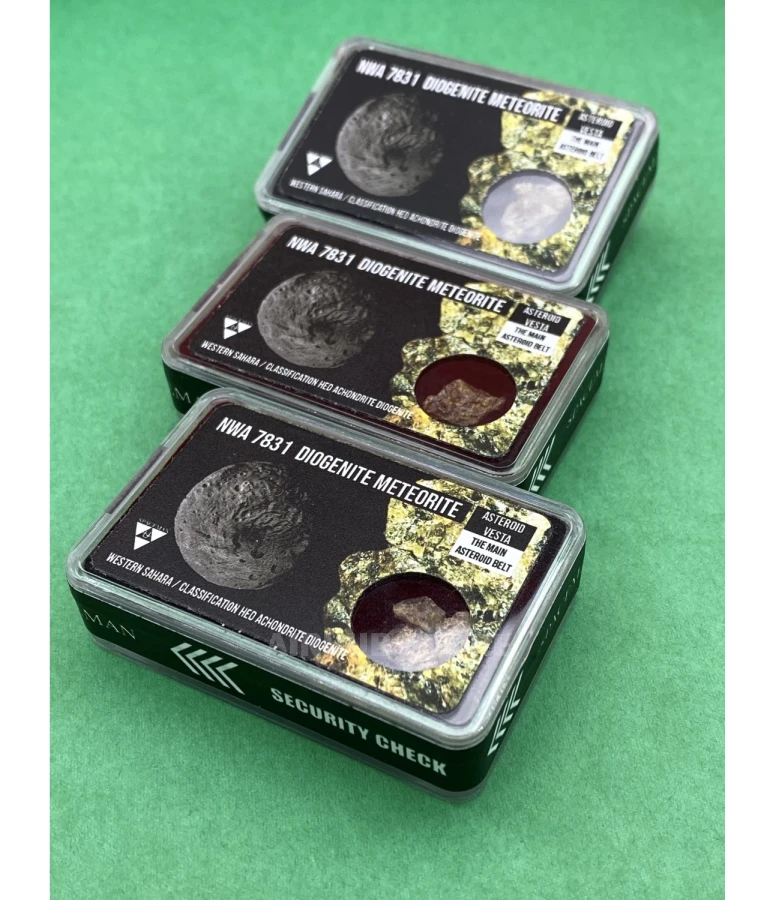 Diogenites are a group of stony meteorites of the achondrite type. Together with howardites and eucrites, they are united in the HED-meteorite clan. HED meteorites are thought to have originated from the asteroid 4 Vesta, with diogenites forming at greater depths than howardites and eucrites and therefore being modified by higher temperatures. Vesta is the largest and brightest asteroid in the asteroid belt and the second largest body (after the dwarf planet Ceres), with an average diameter of about 525 km (326 mi). Several billion years ago, two powerful collisions ejected some of Vesta's mass, and some of this material fell here on Earth as HED meteorites (howardite, eucrite, and diogenite). Amazingly, when you look at photographs of Vesta or Eve through a powerful telescope, you can easily see the craters from which the HED meteorites came.