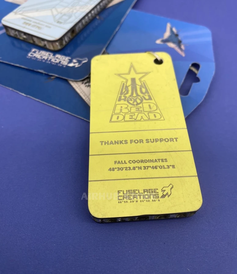 A keychain made of real airplane skin. These parts belonged to a Su-35S, a standard Russian Air Force aircraft, the letter S stands for “Stroyevoy”. The plane was engaged in combat operations against Ukrainian air defense in the Kherson region, near the village of Shlyakhove, and it was there that it met its final fate and was shot down.