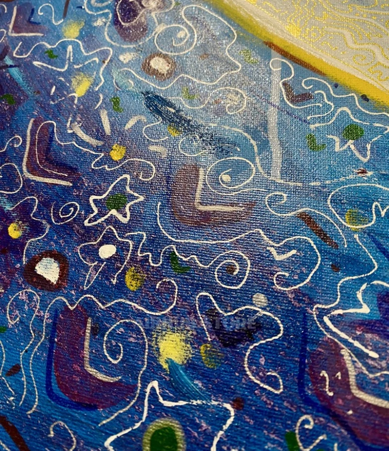 The work was presented at Zhulyany airport as part of an exhibition space dedicated to aviation. The technique is mixed, the artist experimented with textures, layers and visual effects, creating a voluminous and meditative surface.