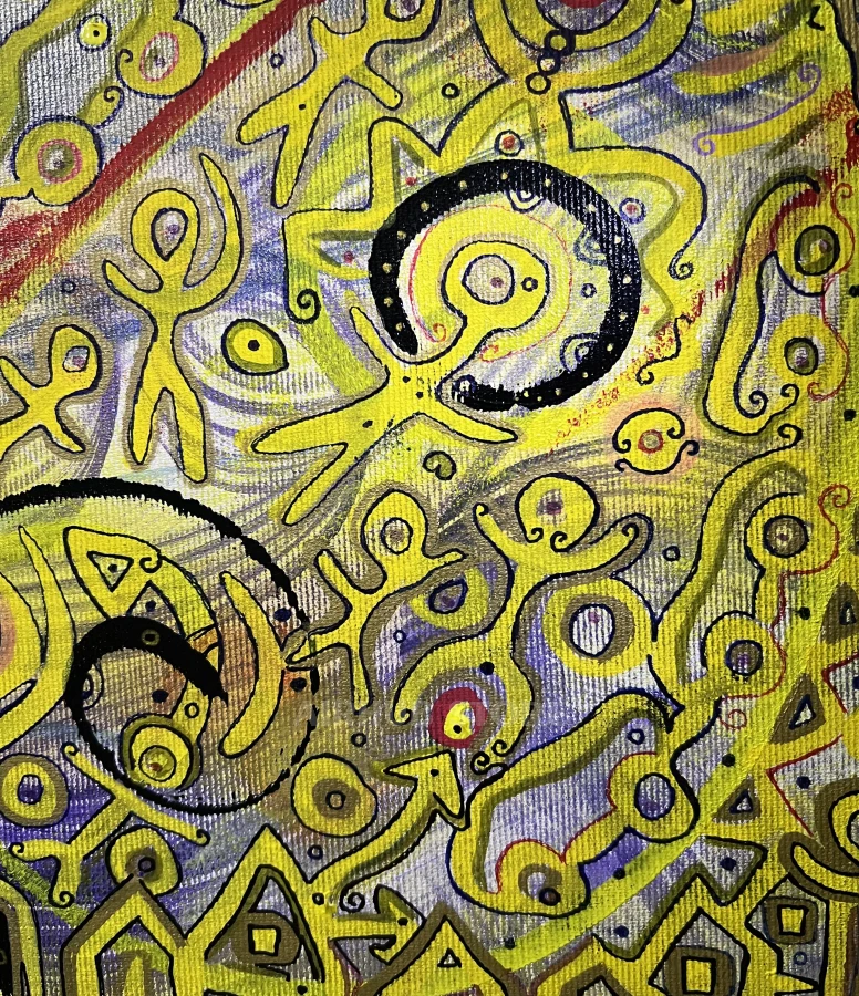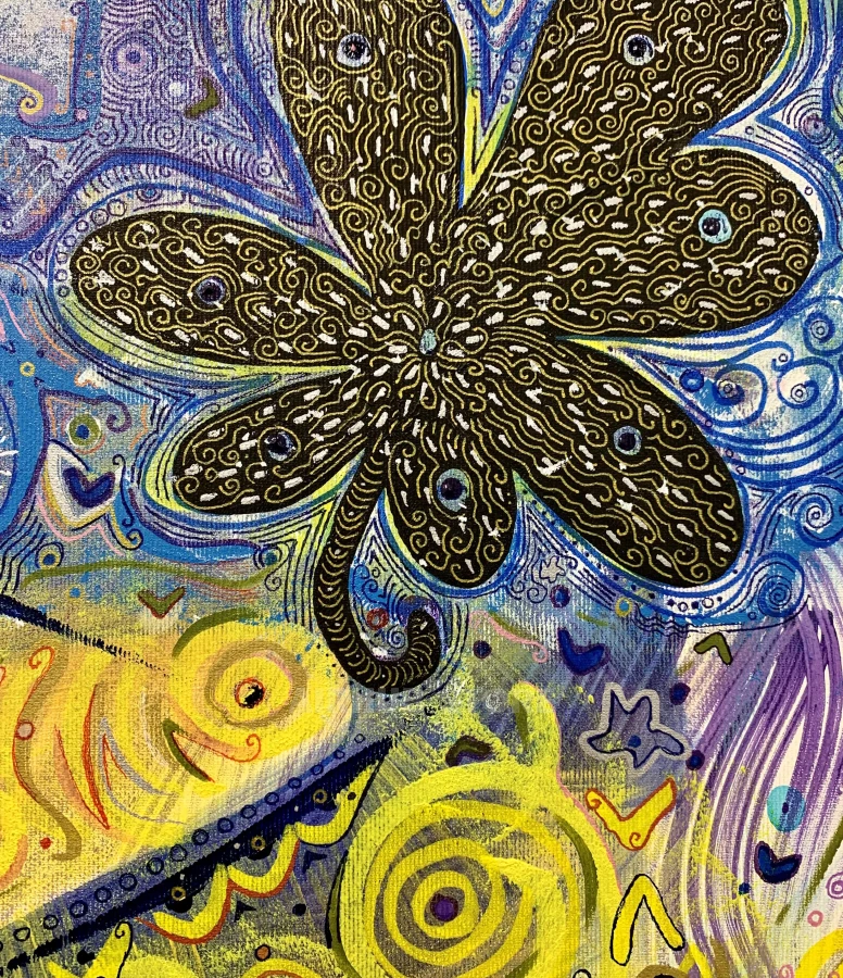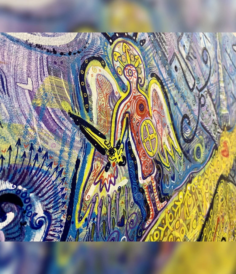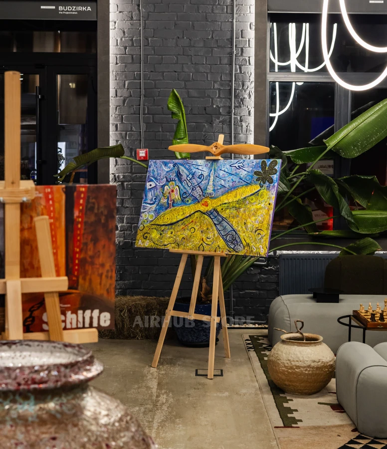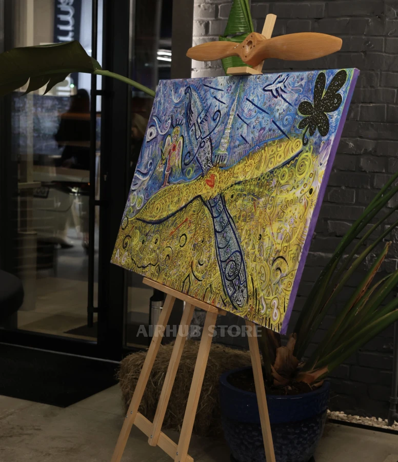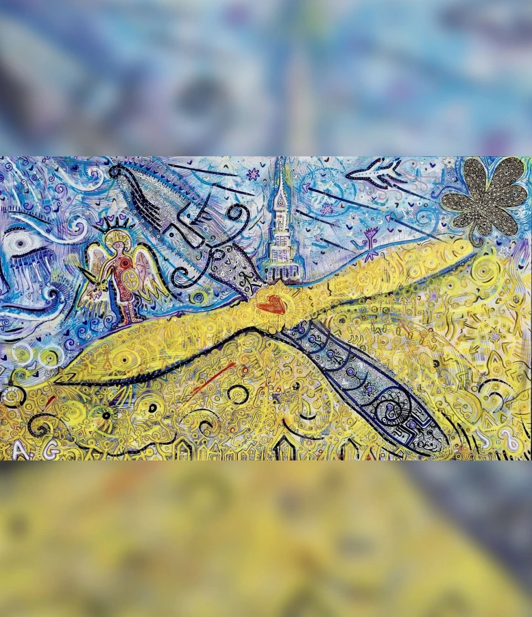 The image of UAV blades dominates the canvas, cutting diagonally across the composition. This is not a decorative element, but the structural axis of the painting, symbolizing protection, control, and movement. In the center of the composition, the main symbols of Kyiv are recognizable — silhouettes of architecture and the author's symbols of the city are integrated into the overall flow of lines and shapes.