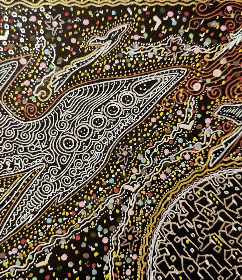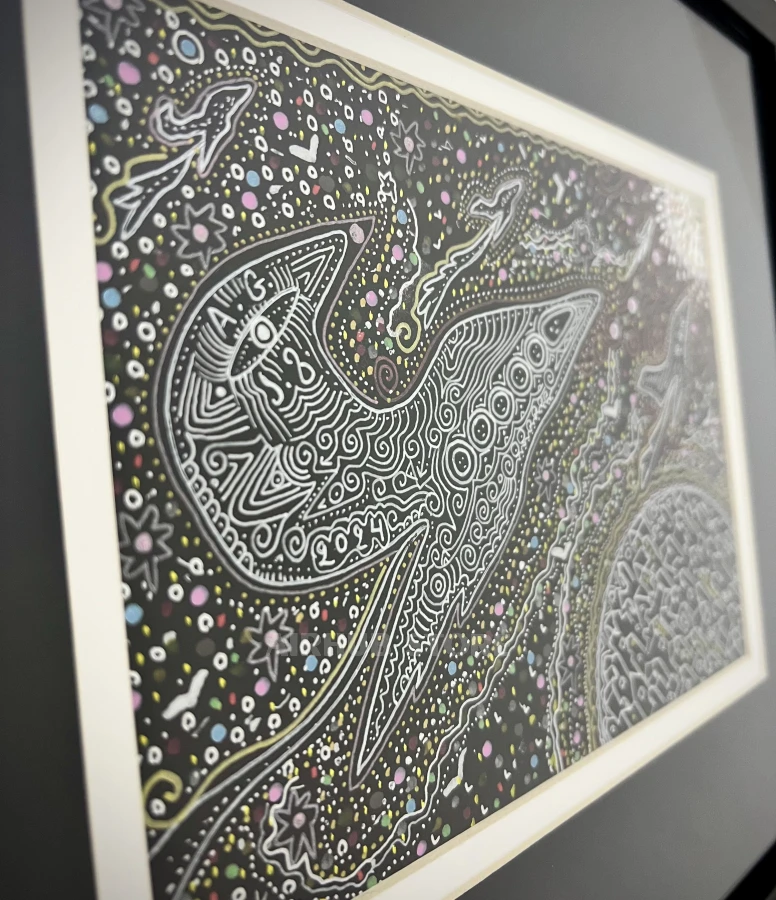 The work is done on art paper using acrylic and Japanese gel pens. The artist's technique creates a sense of movement, tension, and rhythm associated with modern warfare, technology, and airspace.