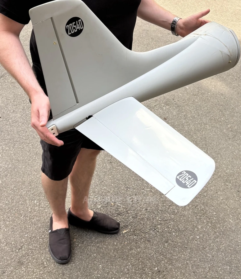 This fragment belongs to a Russian Orlan-10 unmanned aerial vehicle that was shot down by Ukrainian defense forces. The Orlan-10 is an advanced reconnaissance drone that was used by the enemy to target artillery and conduct surveillance. The presented fragment is an authentic part of this drone, saved after it was destroyed in the combat zone.