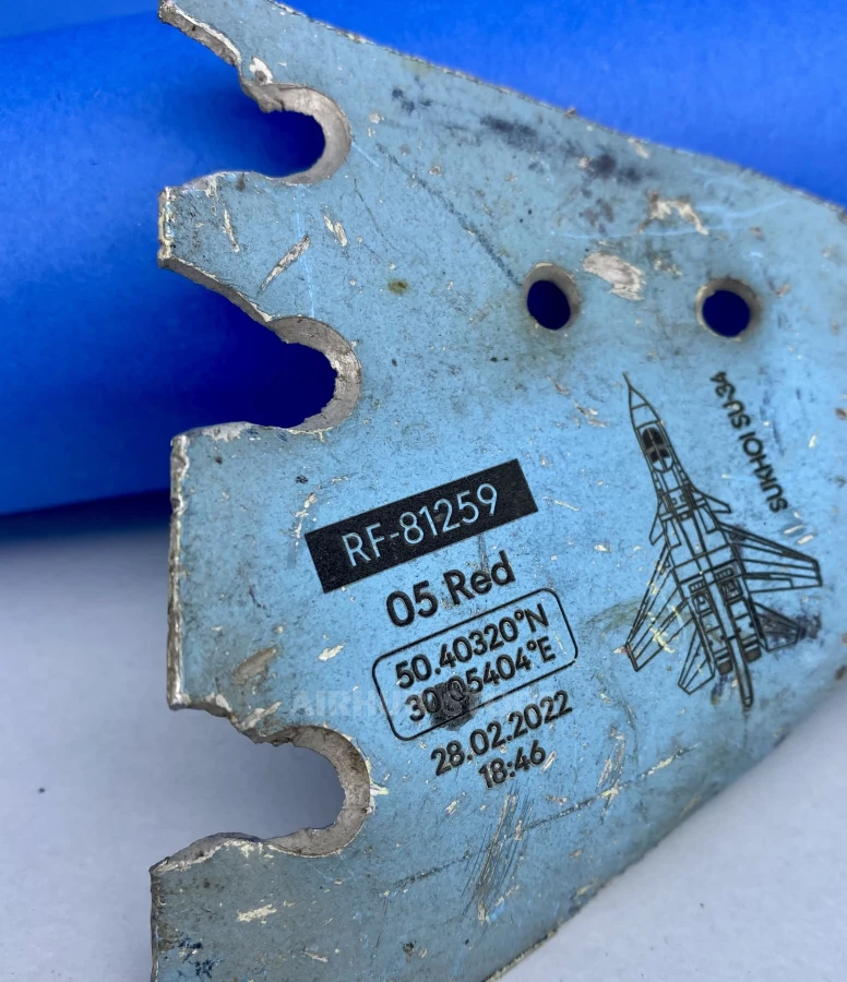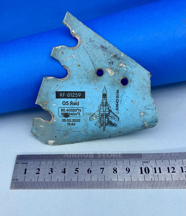 A part of a Russian Su-34 aircraft shot down by Ukrainian troops in Bucha district near Buzova flying club. The call sign of the aircraft is “Red 05” RF-81259