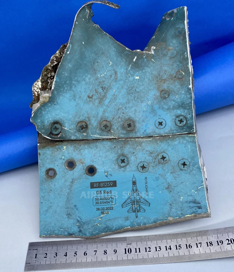 A part of a Russian Su-34 aircraft shot down by Ukrainian troops in Bucha district near Buzova flying club. The call sign of the aircraft is “Red 05” RF-81259