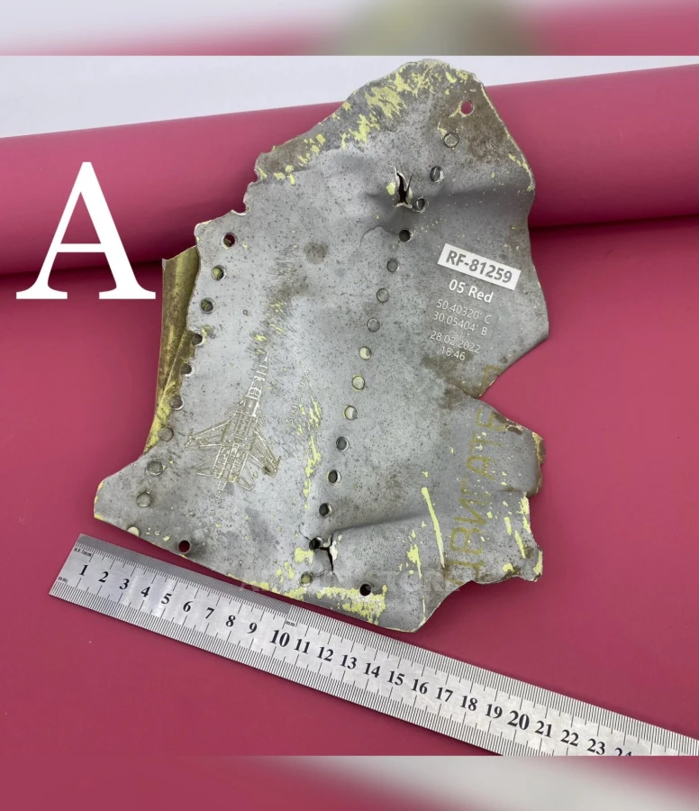 A part of a Russian Su-34 aircraft shot down by Ukrainian troops in Bucha district near Buzova flying club. The call sign of the aircraft is “Red 05” RF-81259
