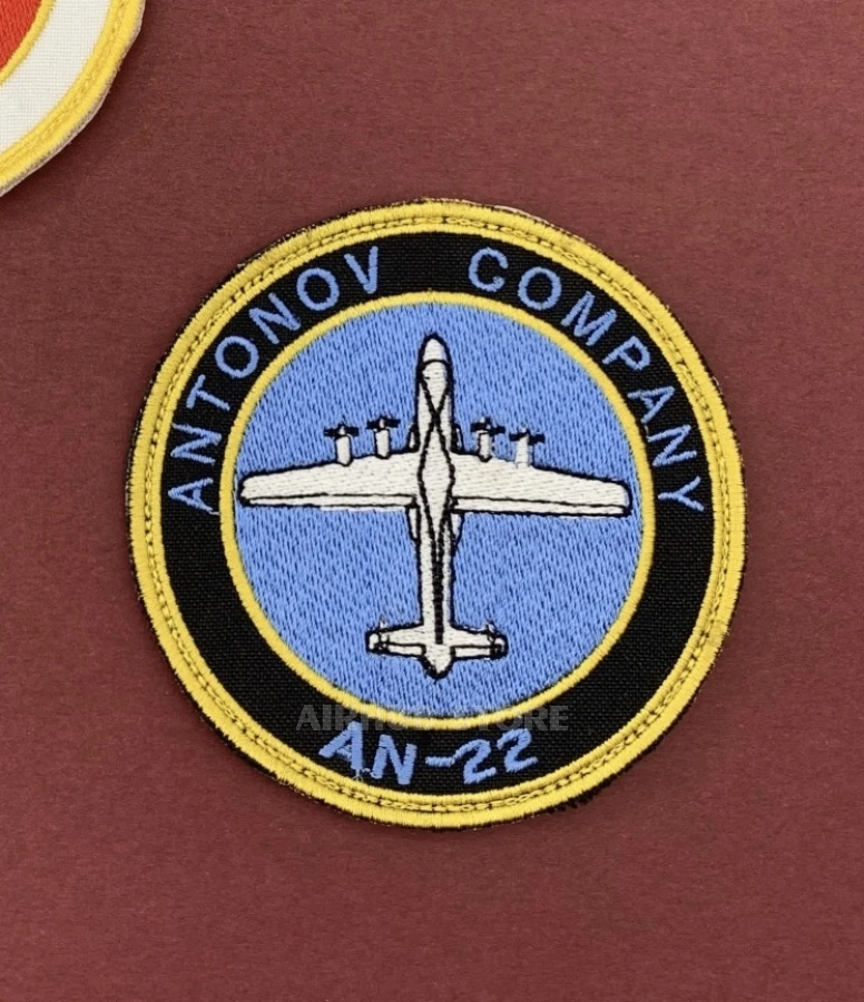 The patch depicts the legendary Antonov An-22. It is a turboprop, wide-body, transport aircraft. It was created in 1965 in Kyiv by the Antonov Aviation Scientific and Technical Complex. The aircraft has set 41 world aviation records.
