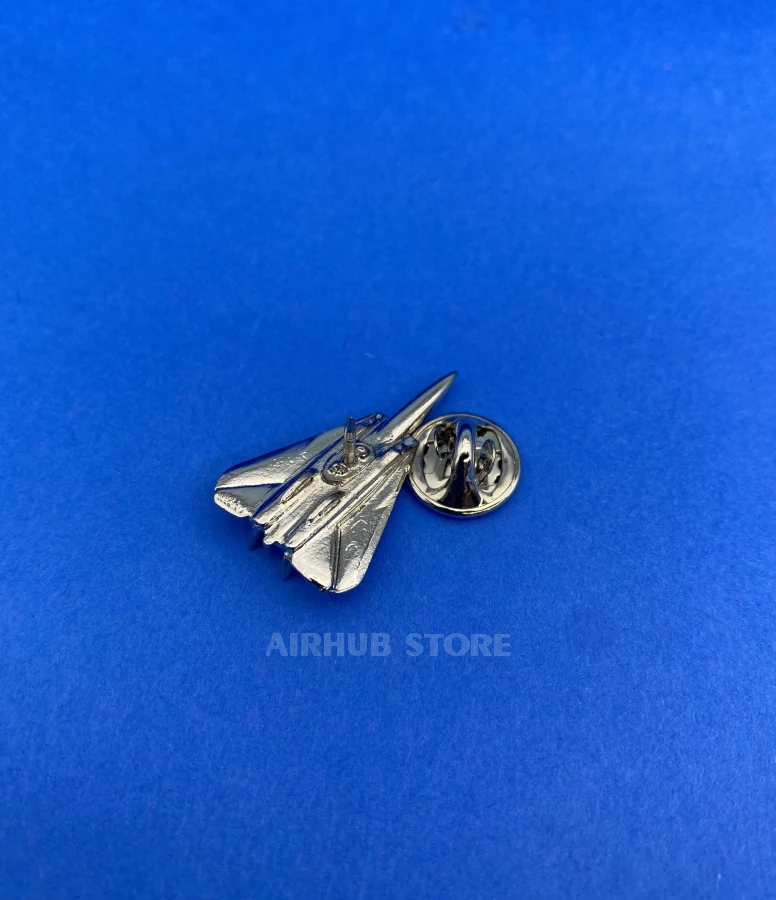 This metal pin replicates the silhouette of the F-14, one of the most famous fighter jets of its time. Its shape is instantly recognizable thanks to its large wingspan, distinctive geometry, and long nose.