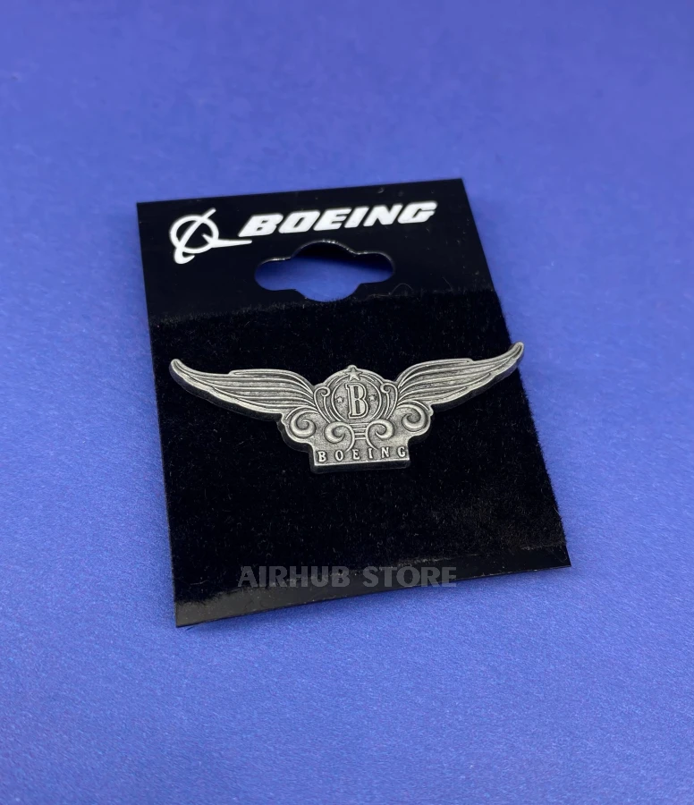 This vintage metal badge with a Boeing in the center and outstretched wings is a reference to the classic badges of civil aviation pilots. Made of cast metal with a matte finish, it is a compact yet expressive accessory that will suit both uniforms and casual styles. It will be perfect as a symbol of belonging to aviation or as a souvenir from the Boeing collection.