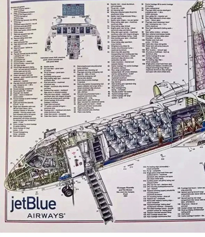Poster with drawing of Boeing 737-400 airplane, the dark blue poster shows the layout diagram of this airplane. This poster will make a great gift for someone who is interested in airplanes and fond of Boeing.