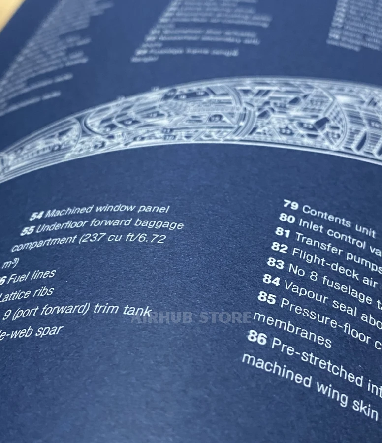 Poster with drawing of Boeing 737-400 airplane, the dark blue poster shows the layout diagram of this airplane. This poster will make a great gift for someone who is interested in airplanes and fond of Boeing.