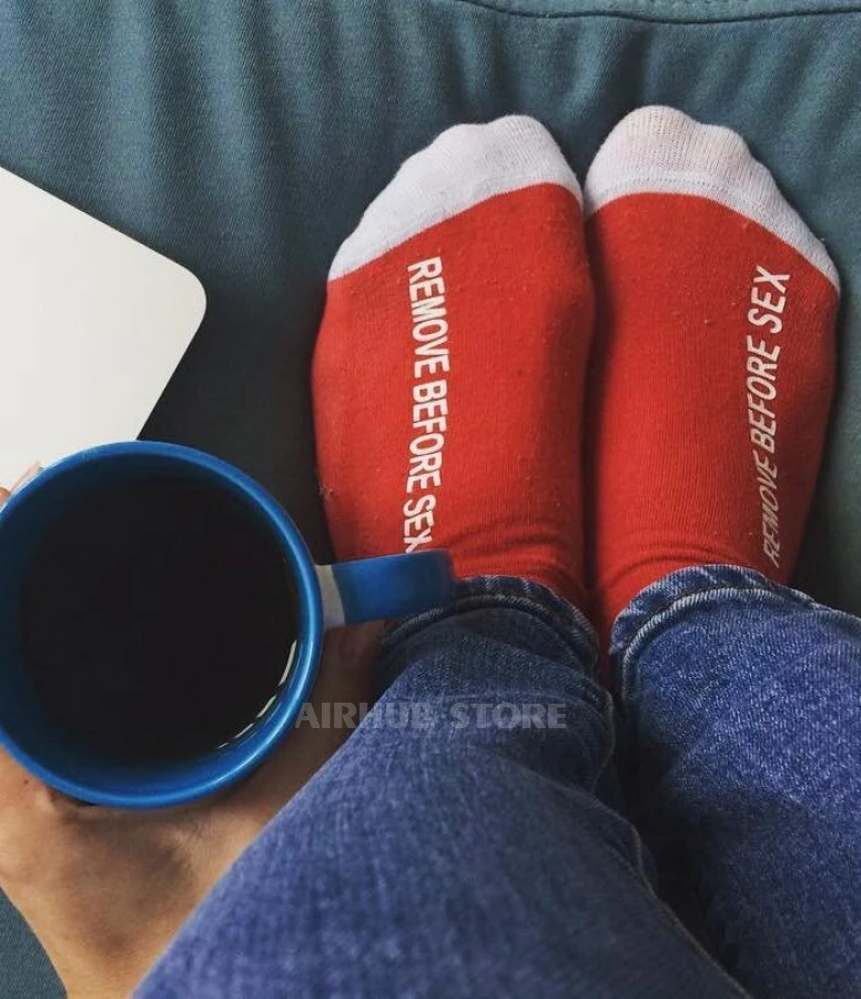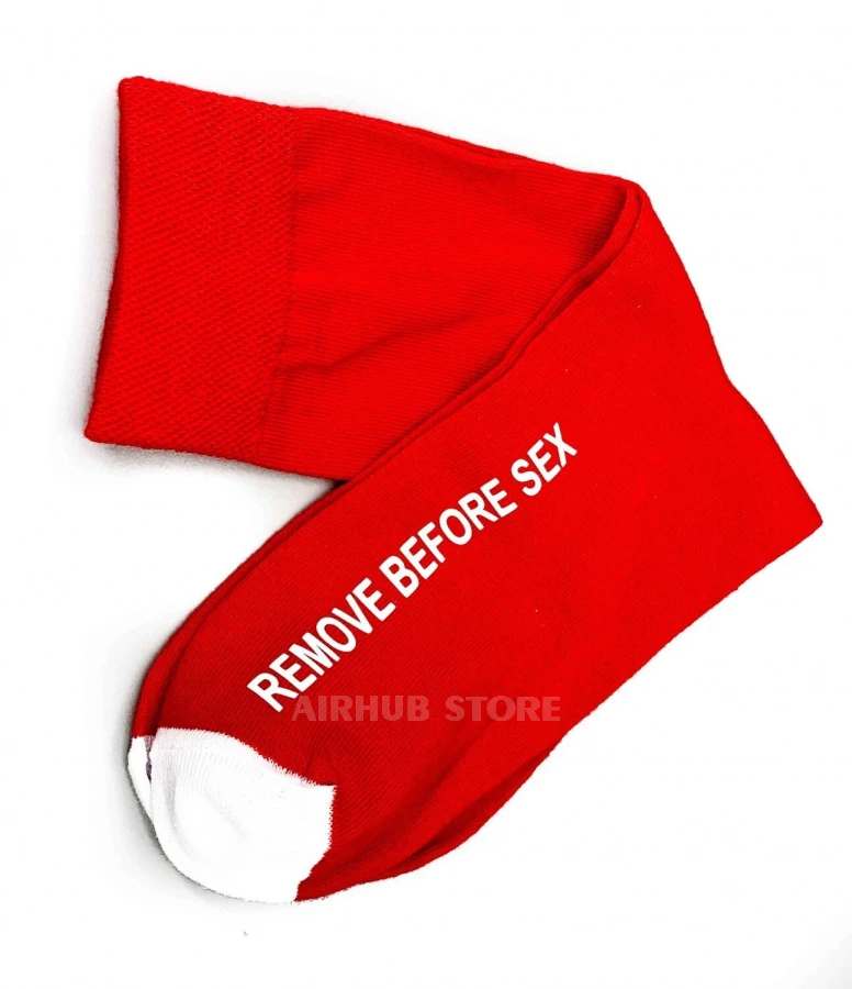 These socks are a playful interpretation of the classic REMOVE BEFORE FLIGHT aviation tape, which is attached to the elements of an airplane before the flight. In our version, it turned into a provocative inscription REMOVE BEFORE SEX - a joke with a double meaning that is understandable to all fans of aviation and good humor.