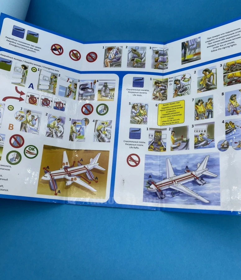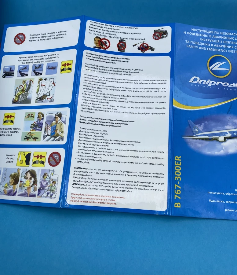 You can order Dniproavia B767-300ER Safety Cards on our website or purchase them at our store located at 50b Khreshchatyk Street, Kyiv. We provide fast delivery anywhere in the world and guarantee the quality of every product.