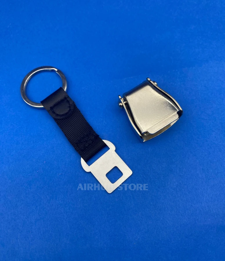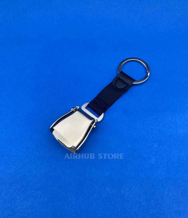 A keychain shaped like a real aircraft seatbelt buckle. The metal mechanism works just like the one on an airplane—you can fasten and unfasten it, feeling that same familiar click.