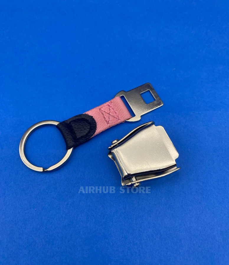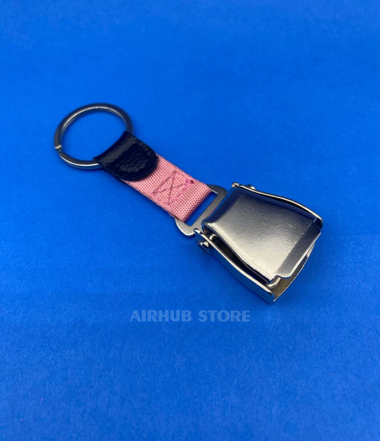 A keychain shaped like a real aircraft seatbelt buckle. The metal mechanism works just like the one on an airplane—you can fasten and unfasten it, feeling that same familiar click.