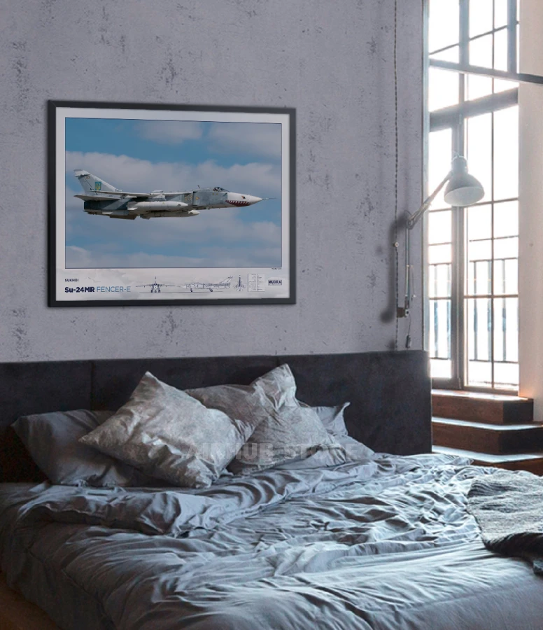 The poster with the Su-24MR (Fencer-E) reconnaissance aircraft is a reconnaissance variant for frontline reconnaissance and ground forces needs based on the Su-24M.