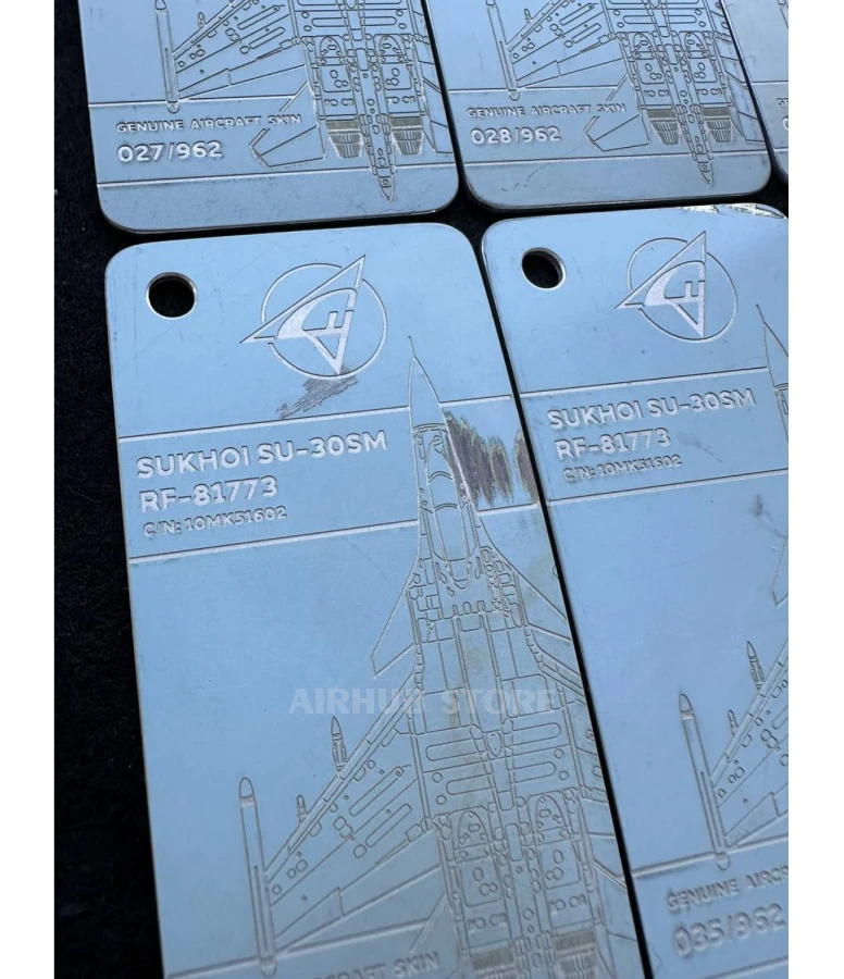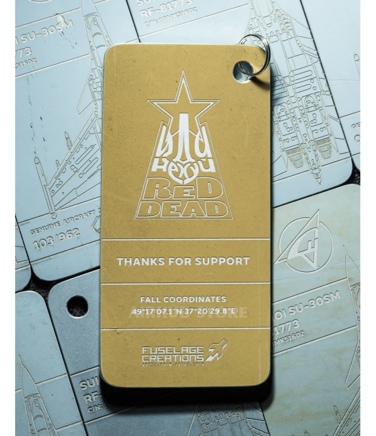 The keychain is made of real airplane skin, the airplane is cut into 286 pieces of keychains, each with its own unique number. The keychains are cut from the fuselage of a Mi-24P, military number 32 Red, registered as RF-95286. It was shot down near the village of Kozarovychi in the Kyiv region of Ukraine on March 5, 2022.