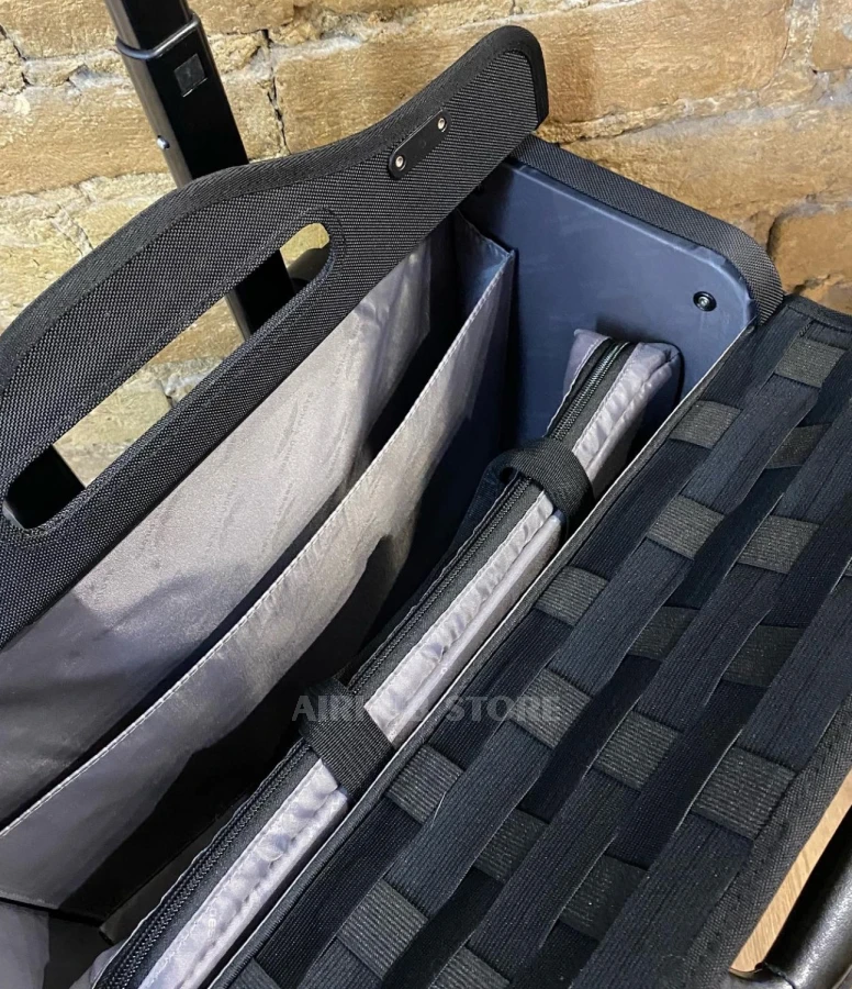 On the back side you can find a mounting loop to carry the Airliner on another trolley. The main case can be secured with two combination locks. The underside of the main lid has elastic straps for storing items such as cables, pens, batteries, flashlights, etc.