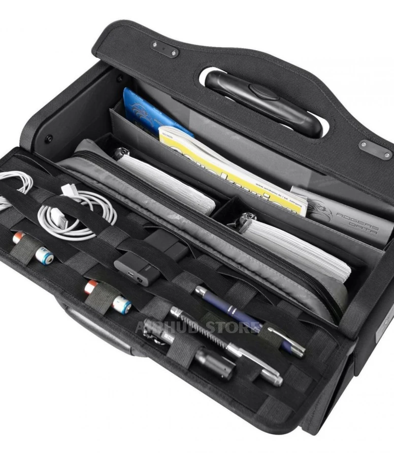 There are two exterior side pockets that can be used for storage, as well as pen holders and a removable key holder. There is a name plate above the left pocket so that you can identify the pilot bag and return it to the owner in case of loss.