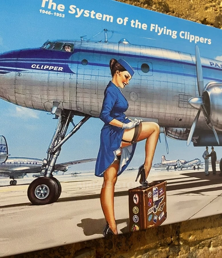 This metal plaque takes us back to the romantic era of the first intercontinental passenger flights, when Pan American World Airways used Clipper airliners to conquer the skies.