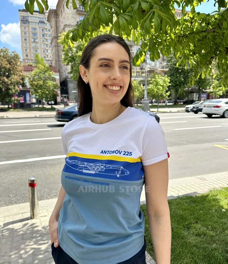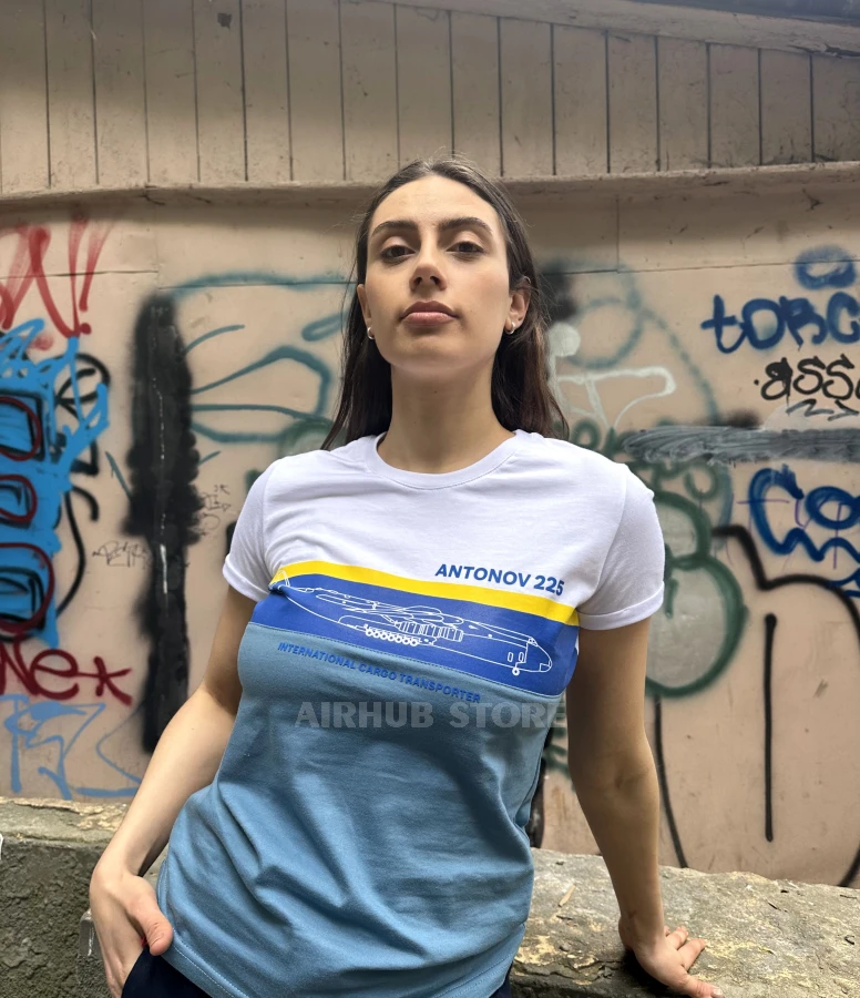 An original women's T-shirt with an image of the AN-225 Mriya airplane.