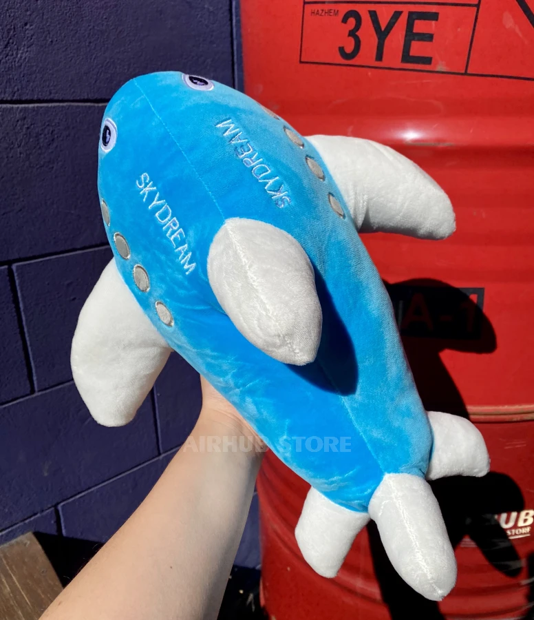 The plane has embroidered windows and expressive eyes, giving it a friendly character. The SKYDREAM embroidery adds individuality and emphasizes the aviation theme.