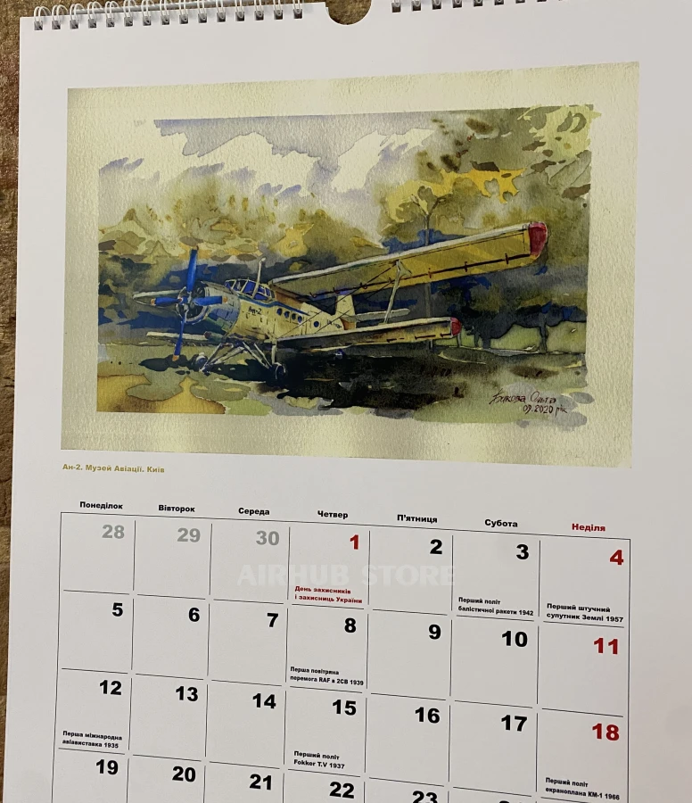 The calendar also marks important historical and aviation dates: the first flights of iconic models, the birthdays of designers, and significant events in the history of Ukrainian and world aviation. This calendar is also suitable as a gift for pilots, aviators, and anyone who loves Ukrainian aviation history.