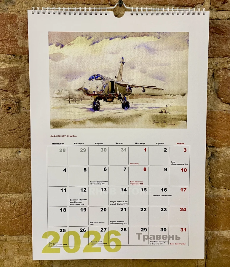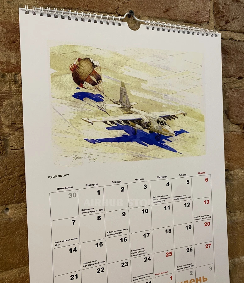 This calendar is a jubilee edition, created in honor of five years of publication. This calendar brings together the best watercolor works from different periods: there are works painted in 2010 right in the Aviation Museum, in 2021 in Uzyn, and in 2024 from photos sent by Ukrainian Air Force pilots. We also added another watercolor painting of the AN-225 Mriya, which is very dear to all of us and now so far away.