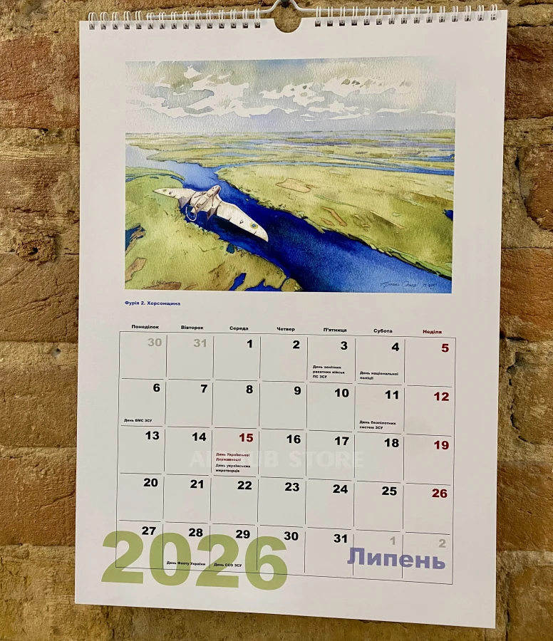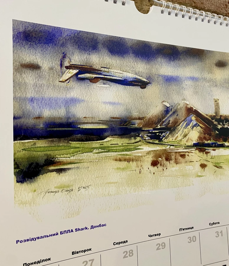 Throughout the year, the calendar features various Ukrainian drones, each in its own atmospheric watercolor scene. Among them are the Shark reconnaissance drone, Raybird 3, RAM-2X loitering munition, Darts Ukrainian kamikaze drone, Sych strike UAV, Fury 2 over Kherson region, Lyuty, Domacha, Leleka-100, and others. All illustrations convey the real places, terrain, and atmosphere in which the drones operate every day, making the calendar look lively and as authentic as possible.