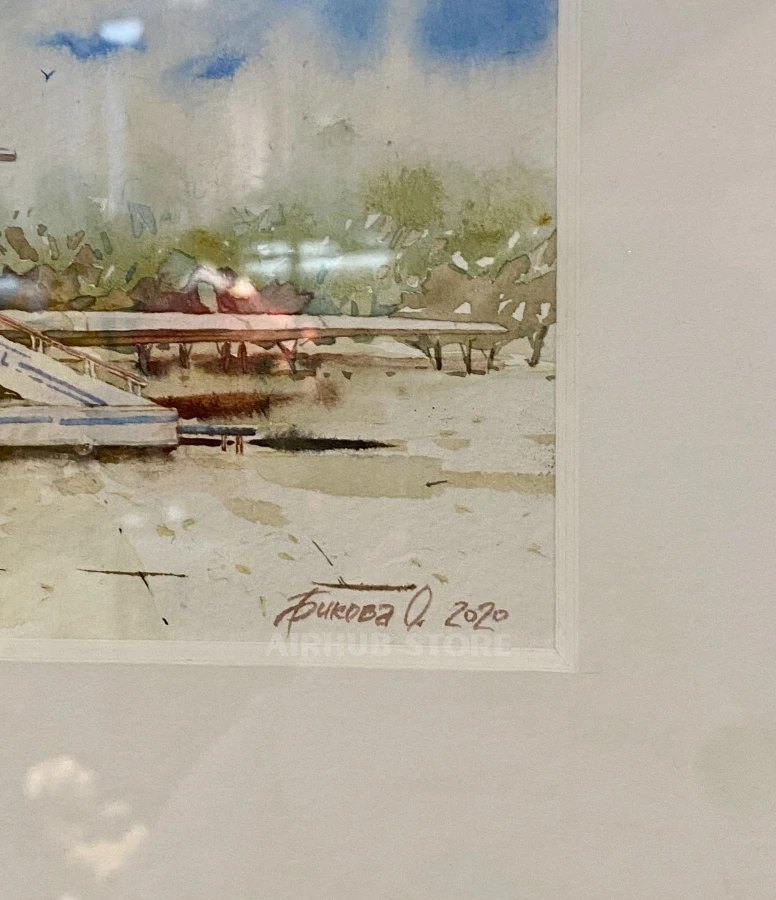 The watercolor is framed in a white Italian frame with a light patina effect and a mat with a distinct bevel.