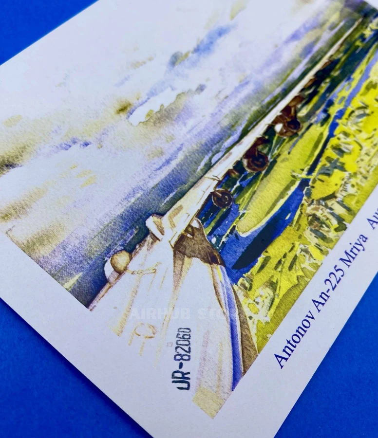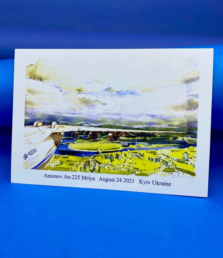 The watercolor technique gives the illustration lightness, depth, and atmosphere, conveying the scale of the aircraft and the space around it. The postcard also features an important date - August 24, 2021, Kyiv, Ukraine, which adds historical and symbolic significance to the work. It was on this day that Mriya made one of its memorable flights over the capital of Ukraine. This postcard will be a wonderful souvenir for aviation collectors, Antonov aircraft enthusiasts, and anyone interested in the history of Ukrainian aviation. It can be sent as a postcard, used as a decorative element, or kept in a collection of aviation souvenirs.