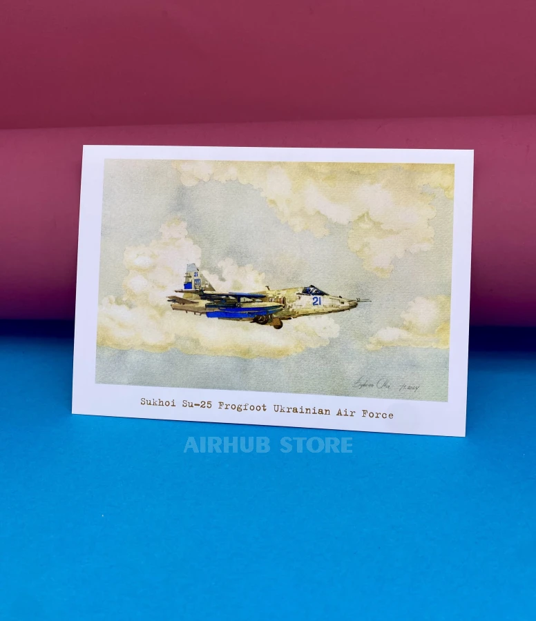 Watercolor postcards Ukrainian Air Force in flight (Su-25 Frogfoot , Cardboard)