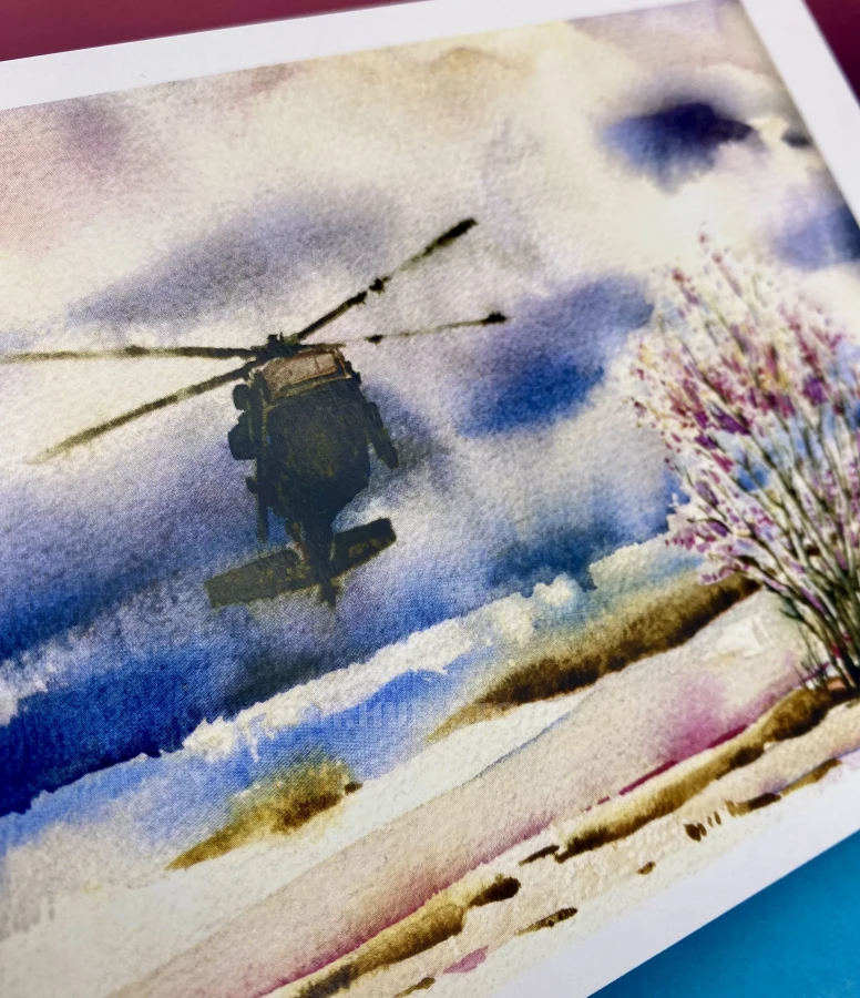 This postcard is based on a real original drawing, made with watercolors on paper. The image is based on a live artwork, where every stroke, color transition, and light and shadow convey the atmosphere of the sky, the speed, and the character of combat vehicles. The theme of the illustrations is centered around the Ukrainian Air Force and Ukrainian military aviation.