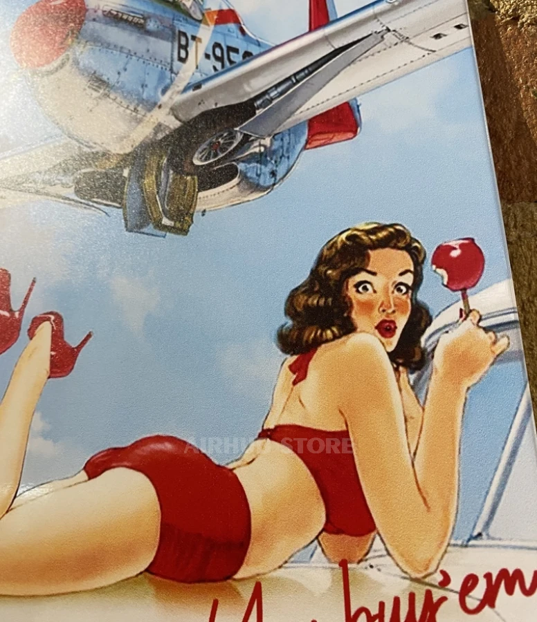 This pin-up style metal sign combines retro charm with an aviation theme. It features an airplane in flight and a girl in a red swimsuit. The sign is made of durable metal with rounded edges and holes for easy mounting. The rich glossy finish preserves the brightness of the colors and gives the effect of a real vintage poster.